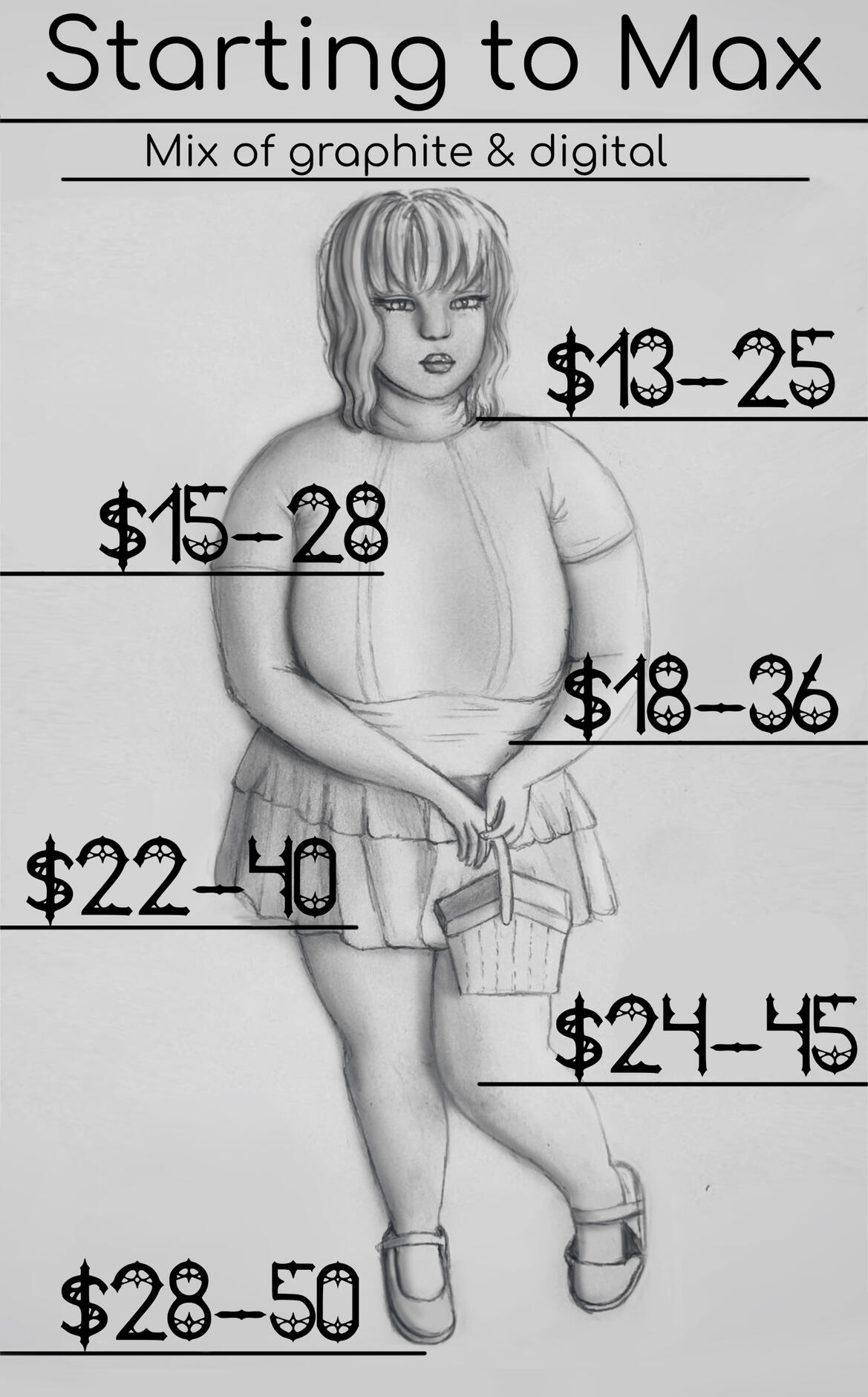 ♡• All artwork will have a subtle watermark. You may not remove any of them.♡• Don't worry about the Price Increasers+ info, as it's a heads up on what may contribute to the official price of your commission. Prices won't skyrocket♡• Commissioned work, and art that I post, is not allowed to be used for any NFT, AI, or crypto purposes. Doing so will get you blacklisted from commissioning me.♡• I have the right to reject a commission for any reason.After payment, you will receive:♡• Sketch(s) that you must accept to pay the rest for, before I continue to work.♡• Full-resolution image (3000px+) of the final drawing, will be sent via best platform.♡• I will let you know if the commission may take longer to complete.